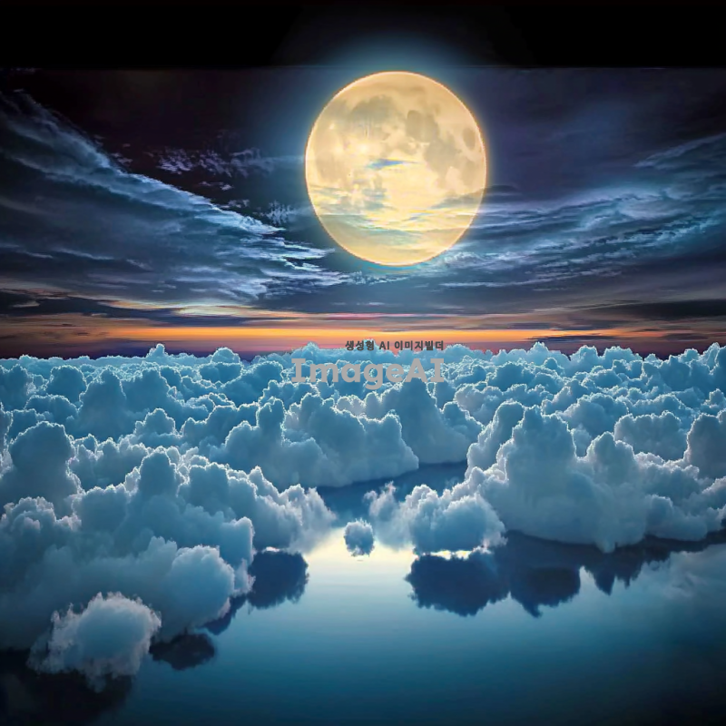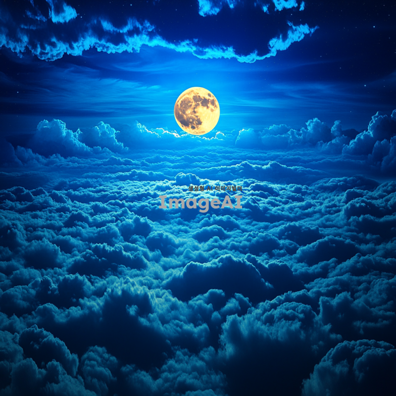 구름 위에 부드러운 달빛이 비치는 무대 배경, 몽환적인 분위기, 은은한 빛과 그림자가 어우러진 풍경, 하늘은 깊은 파란색과 보랏빛으로 물들어 있으며, 구름은 부풀어 오르고 부드러운 질감으로 표현됨, 신비로운 느낌을 주는 요소들 추가