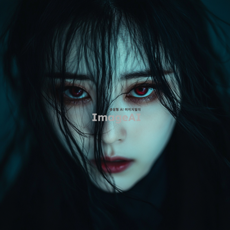 검은 머리카락을 가진 한국 여성, 빨간 눈을 가진, 짝사랑으로 인해 사기결혼한 나쁜 여자. 그녀는 교활한 미소를 지으며, 어두운 배경 속에서 음모를 꾸미고 있는 모습. 그녀의 표정은 매혹적이지만, 한편으로는 위험한 느낌을 주며, 주변에는 불길한 분위기가 감도는 장면.