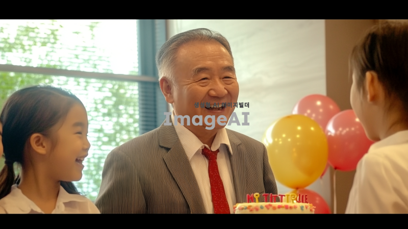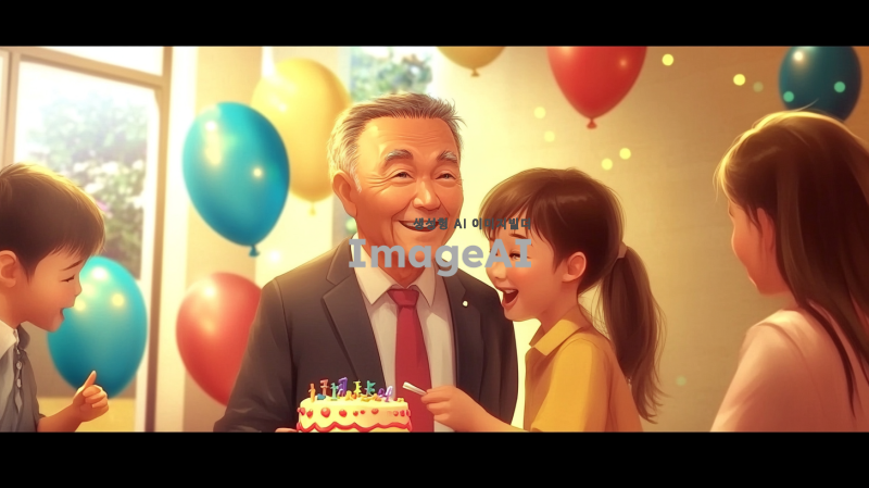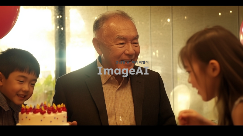 할아버지의 생신을 축하하는 분위기 속에서 가족이 함께 모여 즐거운 시간을 보내는 장면. 할아버지의 생신 케이크 앞에서 손주들이 퀴즈를 내고 있는 모습, 할아버지는 미소를 지으며 퀴즈를 듣고 있고, 주변에는 풍선과 장식이 어우러져 있는 따뜻하고 행복한 분위기. 가족들이 서로 웃으며 이야기를 나누고 있는 모습.