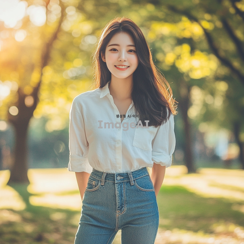 청바지를 입고 있는 한국인 여성, 자연스러운 포즈로 서 있는 모습, 밝은 햇살 아래에서 미소를 짓고 있는 모습, 배경은 화창한 공원, 편안하고 캐주얼한 스타일, 청바지의 디테일이 잘 보이도록, 청량한 분위기.