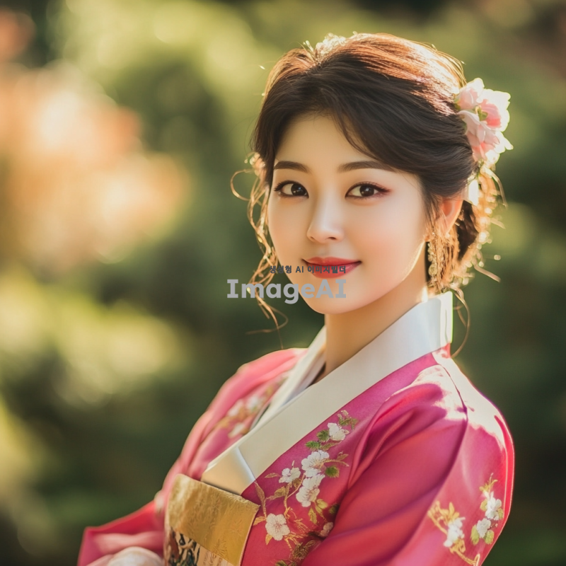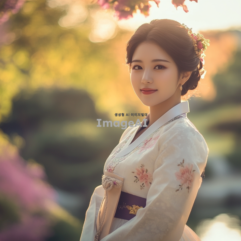 한국의 전통 의상을 입고 있는 아름다운 여성, 우아한 포즈, 부드러운 조명 아래에서 화사한 미소를 지닌 모습, 배경에는 한국의 고전적인 정원 풍경이 어우러져 있는 장면.
