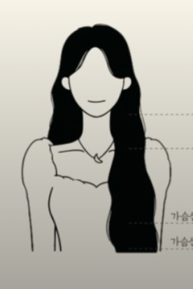 긴 머리를 가진 여자 일러스트, 채색이 안되어 있고 선으로만 그려져 있는 일러스트, 얼굴 표정은 세세히 묘사를 안되어 있는 일러스트, 아이콘처럼 단순하게 그려져 있는 일러스트, 귀와 어깨는 무조건 그려져 있어야 함.