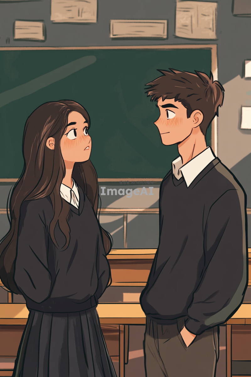 학교 교실 안에서 서로를 바라보며 떨리는 순간을 맞이하는 여학생과 남학생의 모습. 여학생은 긴 생머리에 교복을 입고, 부끄러워하는 표정을 지으며 고백하는 모습. 남학생은 짧은 머리에 편안한 교복을 입고, 놀라면서도 행복한 표정을 짓고 있는 모습. 배경은 교실의 책상과 칠판이 보이는 아늑한 분위기로, 두 사람 사이에 긴장감과 설렘이 느껴지는 장면. 웹툰 그림체로 생동감 있게 표현.