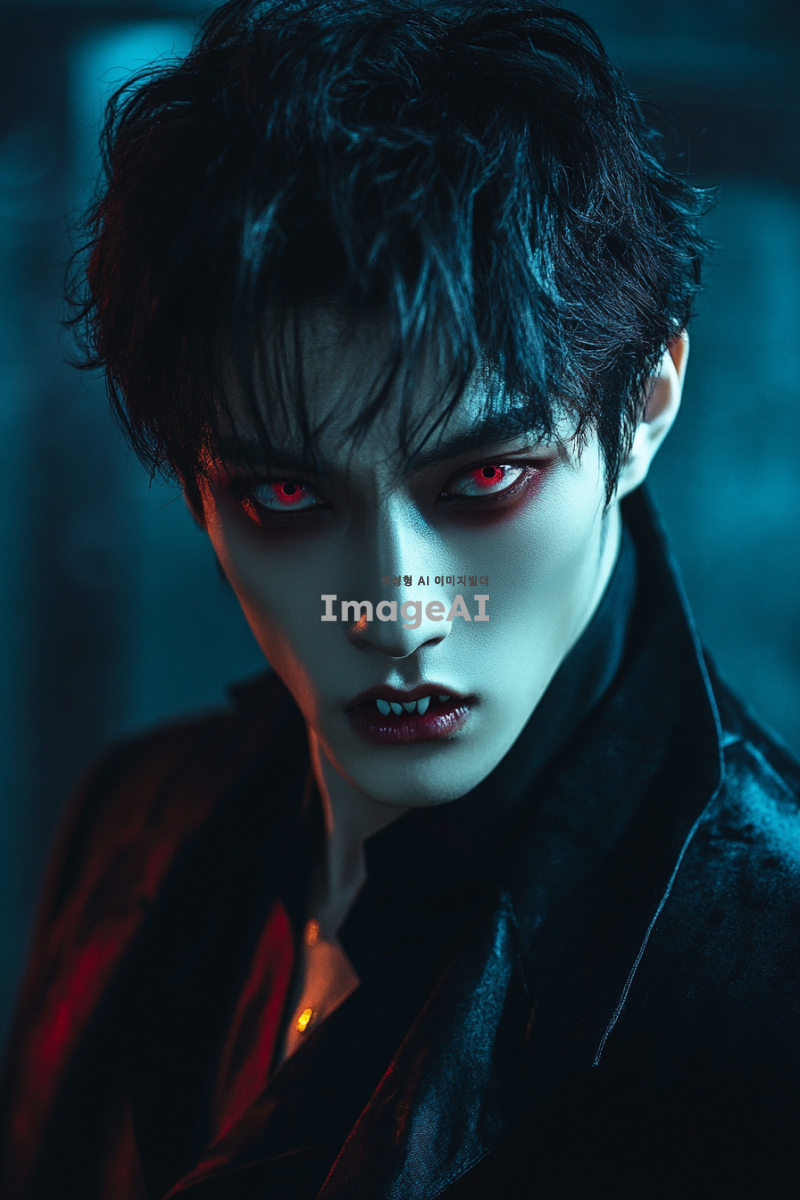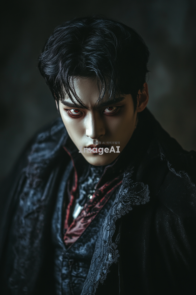 잘생기고 근육 많은 한국인 뱀파이어, 어두운 배경 속에서 강렬한 눈빛을 가진 모습, 세련된 복장과 날카로운 이빨이 강조된 표정, 신비로운 분위기를 자아내는 조명, 고딕 스타일의 요소가 가미된 환경.