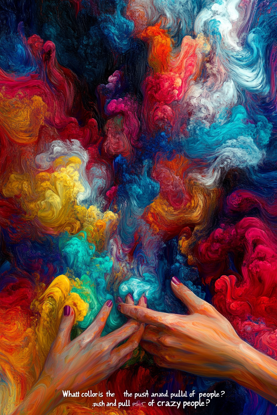 '미친놈들의 밀당은 어떤색입니까'를 주제로 무지개 빛의 색 유화 일러스트. 색과 빛의 조화가 어우러지고, 유화의 붓터치 질감이 살아있는, 열정과 냉정, 번영과 쇠퇴를 동시에 느낄 수 있는.