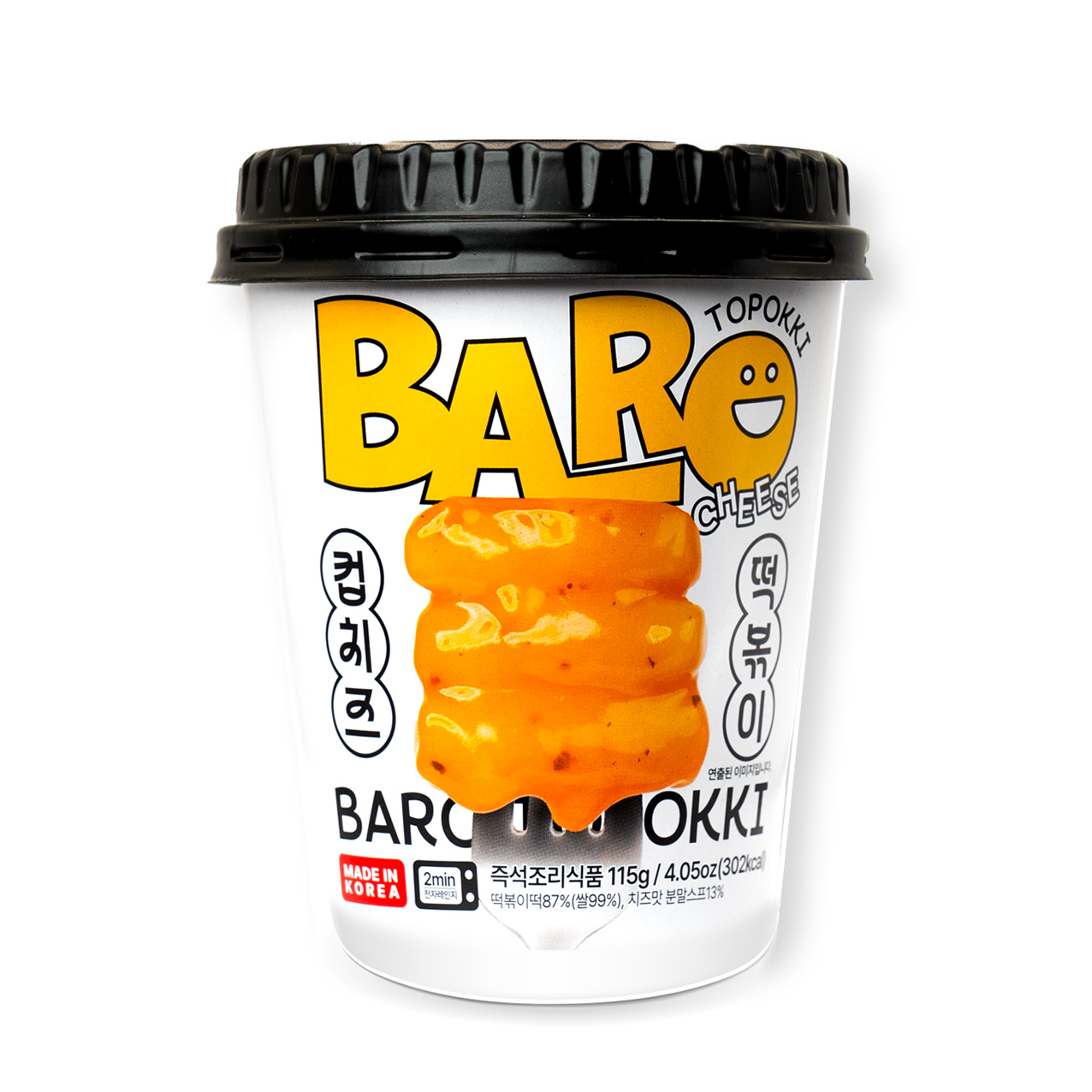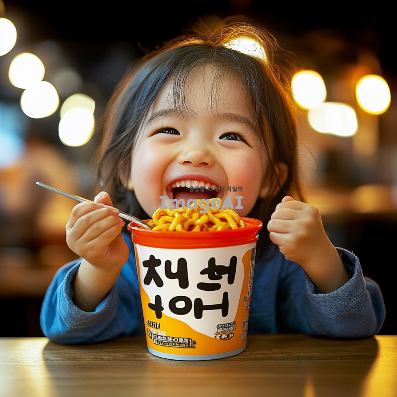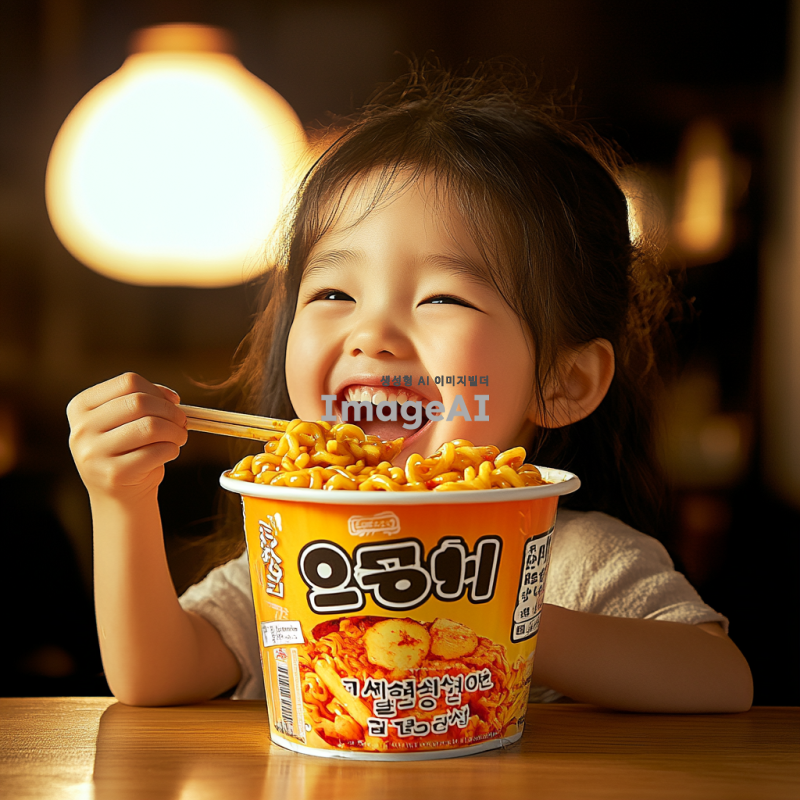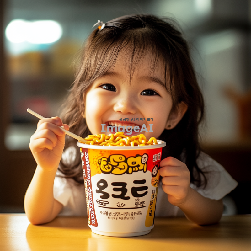 미국 여자 아이가 밝게 웃으며 컵라면에서 떡볶이를 들고 먹고 있는 모습, 따뜻한 조명 아래에서 즐거운 분위기, 다양한 색상의 컵라면과 떡볶이, 배경은 아늑한 주방이나 식탁, 아이의 표정은 행복하고 즐거움이 가득한 모습으로 표현.