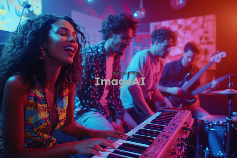 왼쪽부터 오른쪽으로 6명의 사람들이 있는 장면. 첫 번째로 긴 웨이브 머리를 가진 여성이 앉아서 건반을 연주하고 있으며, 두 번째와 세 번째는 일렉기타를 치고 있는 남성 두 명, 네 번째는 베이스를 연주하는 남성 한 명, 다섯 번째는 짧은 웨이브 머리의 남성 보컬, 마지막으로 여섯 번째는 짧은 웨이브 머리의 남성 드러머가 있습니다. 모두 음악에 몰두하고 있는 모습으로, 배경은 공연 무대처럼 꾸며져 있습니다.