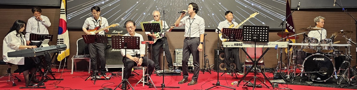 무대 위에서 연주하는 12명의 음악가들. 뒷줄에는 서서 연주하는 8명이 있다. 왼쪽부터 오른쪽으로 긴 웨이브 머리의 여자 건반 연주자, 일렉기타를 치는 남자 2명, 베이스를 치는 남자 1명, 짧은 웨이브 머리의 보컬 남자 3명, 짧은 웨이브 머리의 드럼 남자 1명이 배치되어 있다. 앞줄에는 앉아서 연주하는 4명이 있다. 왼쪽부터 짧은 머리의 여자 건반 연주자, 짧은 머리의 여성 통기타 연주자, 통기타를 치는 남자 2명이 자리잡고 있다. 무대 조명은 화려하게 비추고, 관객들이 즐겁게 감상하는 모습이 보인다.