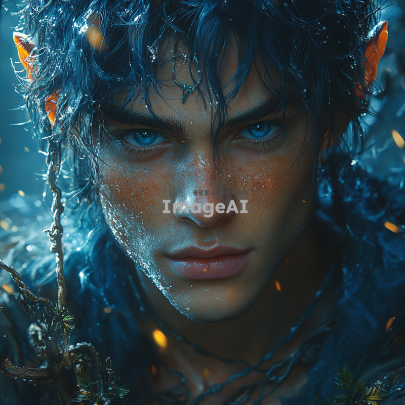 군청색 머리를 가진 미청년, 엘프 귀를 가진 단발 스타일의 남성, 환상적인 배경과 함께, 부드러운 표정, 세련된 의상, 자연광이 비치는 모습, 신비로운 분위기.