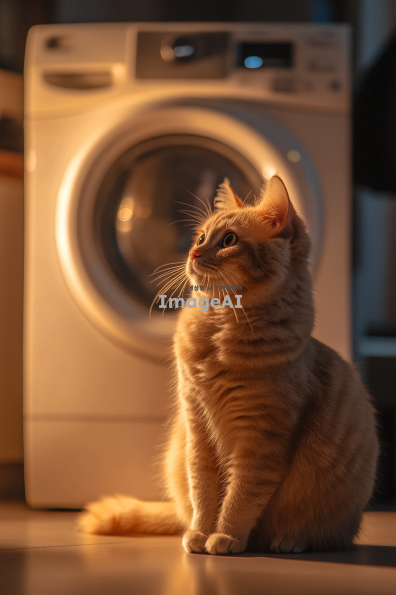 고양이가 세탁기 앞에 얌전히 앉아 있는 모습, 부드러운 털과 큰 눈을 가진 한국 고양이, 세탁기에서 나오는 따뜻한 빛, 아늑한 실내 배경, 고양이의 귀여운 표정과 편안한 자세 강조