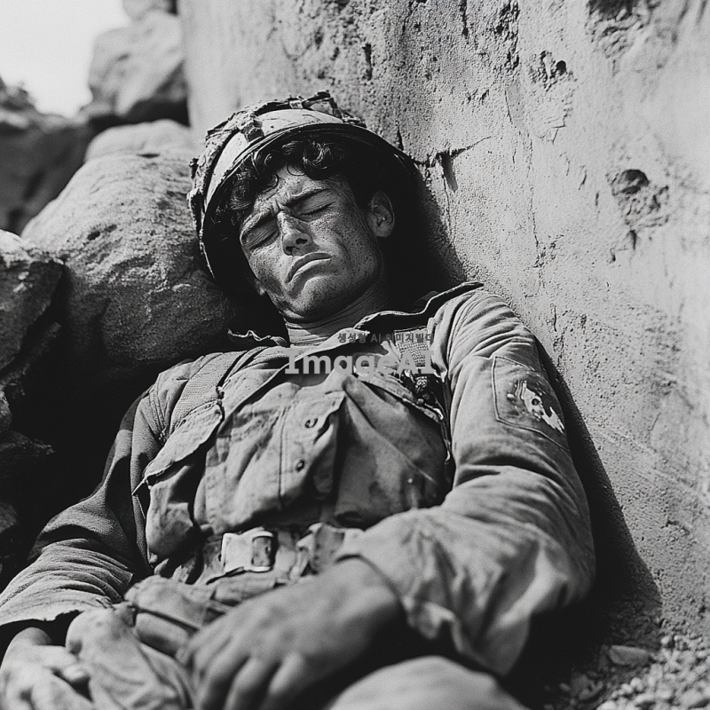 전쟁 중에 한 병사가 지쳐있는 느낌
