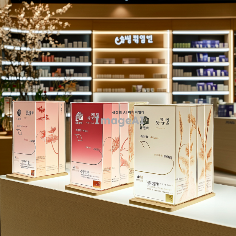 세 개의 동일한 상품이 나란히 진열되어 있는 모습, 각 상품은 세련된 디자인의 포장으로 둘러싸여 있으며, 배경은 깔끔하고 현대적인 느낌의 상점 내부. 조명은 부드럽고 따뜻한 분위기로, 상품의 디테일이 잘 보이도록 강조. 상품은 한국에서 인기 있는 아이템으로, 소비자들이 관심을 가질 만한 매력적인 요소를 포함.