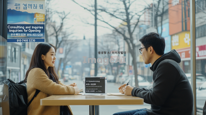 한국의 현대적인 도시 풍경을 배경으로, 상담을 받고 있는 한국인 남성과 여성의 모습. 두 사람은 테이블에 앉아 있으며, 한쪽에는 상담 자료가 놓여 있고, 다른 쪽에는 전화번호가 적힌 명함이 있다. 명함에는 "컨설팅 및 개업문의"라는 문구와 함께 "010-9033-5230", "010-7405-5230"이라는 전화번호가 선명하게 보인다. 주변은 아늑하고 전문적인 분위기로, 창 밖으로는 도시의 모습이 보인다.