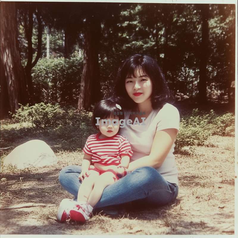옛날 사진, 아시아계 어머니와 아이가 공원에서 땅에 앉아 있다. 어머니는 빨간 줄무늬 셔츠를 입은 아기 딸을 안고 있다. 그들 뒤에는 초록색 나무가 있고 근처에는 흰색 바위가 있으며, 80년대 스타일의 이미지이다.