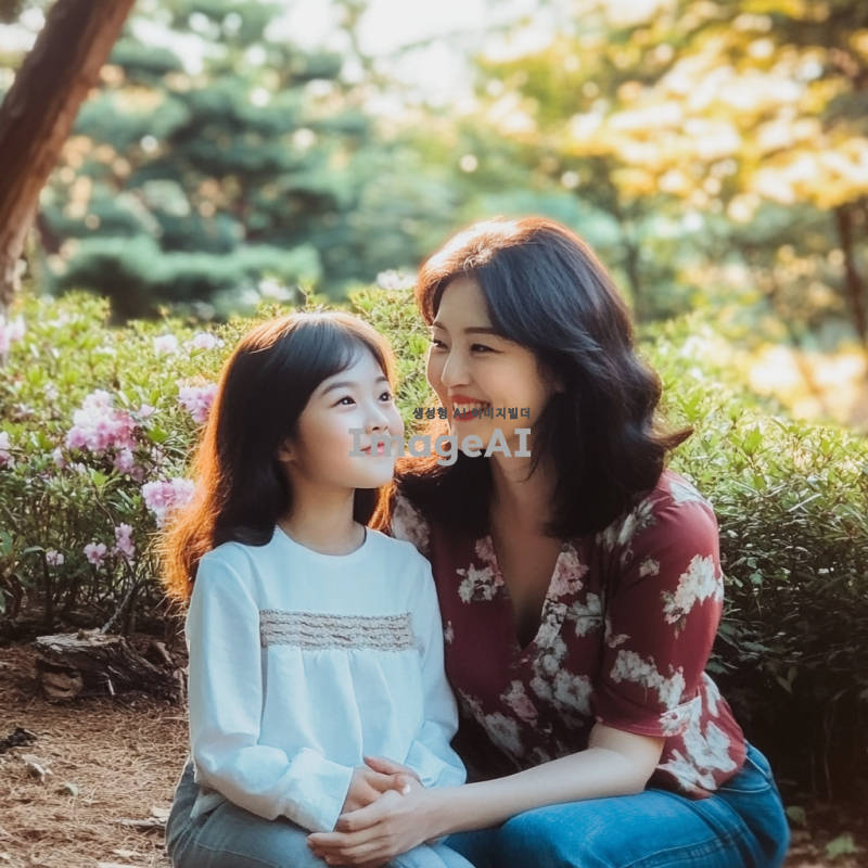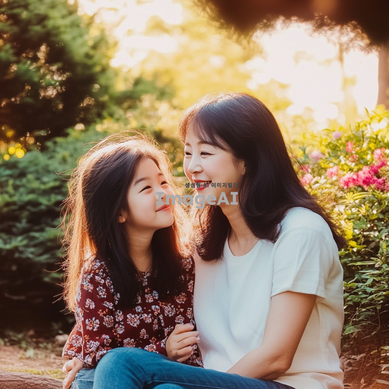 웃으며 서로 쳐다보는 한국인 엄마와 딸 모습, 따뜻한 햇살 아래 공원에서 자연스럽게 웃고 있는 장면, 배경에는 푸른 나무와 화사한 꽃들이 만개해 있는 풍경, 두 사람의 표정은 행복하고 친밀한 느낌을 주며, 서로의 눈을 바라보는 순간을 포착한 이미지.