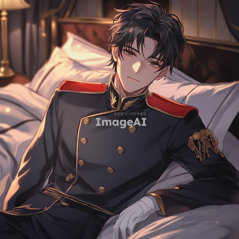 새까만 머리카락과 눈동자를 가진 잘생긴 남성. 머리카락 길이는 평균보다 살짝 긴 정도. 약간 삐딱한 자세로 침대에 걸터앉아 있음. 귀족들이 입을 만한 제복을 입고 있음. 고급스럽고 우아하면서도 어둡고 피폐한 분위기. 나른한 표정.