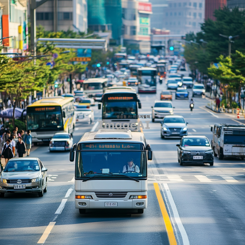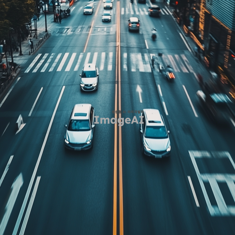 한국의 도시 도로에서 주행 중인 현대적인 자동차, 주변에는 다른 차량과 보행자가 어우러진 도시의 활기찬 모습,현재 운행되는 차량 모델과 같은 사실적인 사진,2종