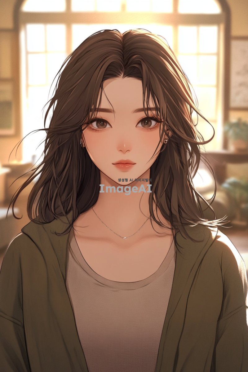 쇄골뼈 아래 길이의 매직 스타일 머리로, 부드러운 윤기가 흐르는 머리카락이 자연스럽게 떨어지는 모습. 한국인 여성의 얼굴을 가진 인물로, 편안한 표정과 함께 정면을 바라보고 있는 모습. 배경은 부드러운 색조의 실내 공간으로 설정하여 아늑한 분위기를 연출.