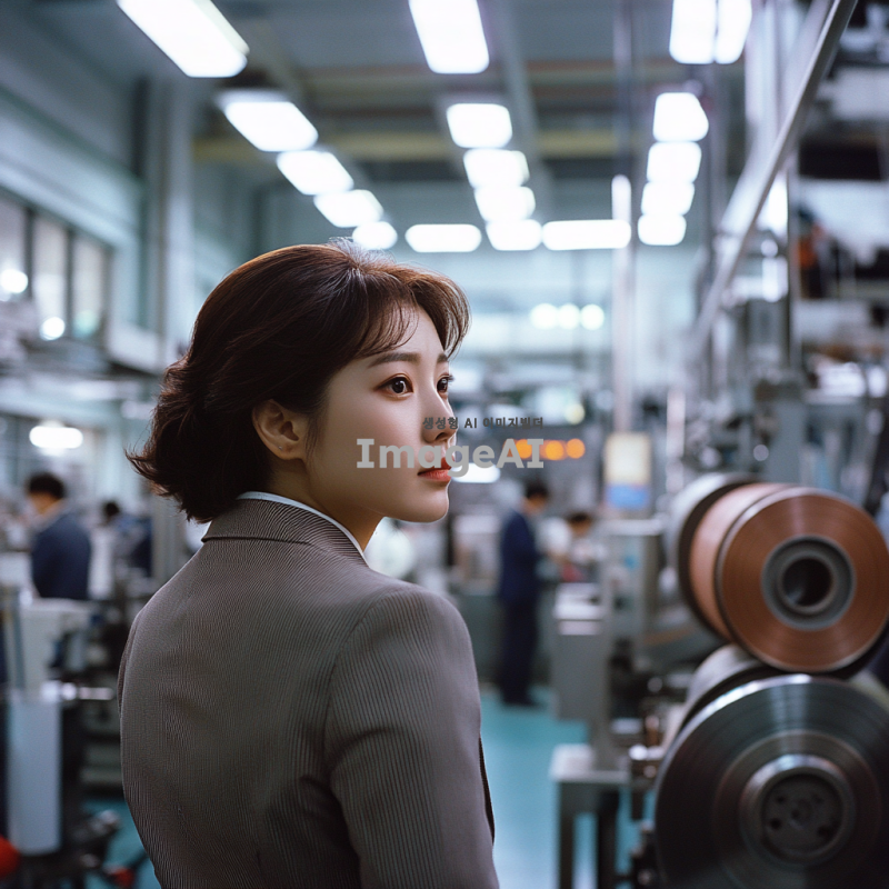 PPF 필름 생산 공장에서 필름을 생산하는 장면. 공장 내부는 현대적이고 깔끔하며, 자동화된 기계들이 작동하고 있는 모습. 필름이 생산되는 과정이 잘 보이도록 디테일하게 표현. 그 앞에 정장을 입고 있는 20대 한국인 여성, 자신감 있는 표정으로 공장을 바라보며 서 있는 모습. 배경에는 다양한 필름 롤과 작업자들이 바쁘게 움직이는 모습이 포함되어 있음.