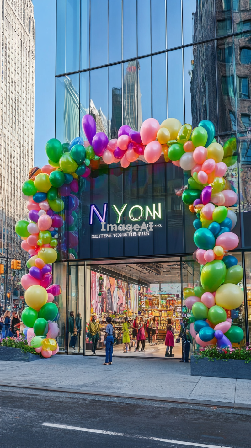 장면 설명: 한복판에 위치한 뉴욕의 올리브영 N 매장 외부. 매장 앞에는 화려한 리본과 풍선으로 장식된 아치가 세워져 있고, 다양한 색상의 꽃들이 장식되어 있다. 매장 유리창을 통해 내부의 다양한 제품들이 빛을 받으며 반짝이고 있다.