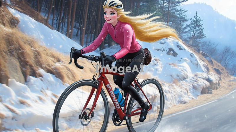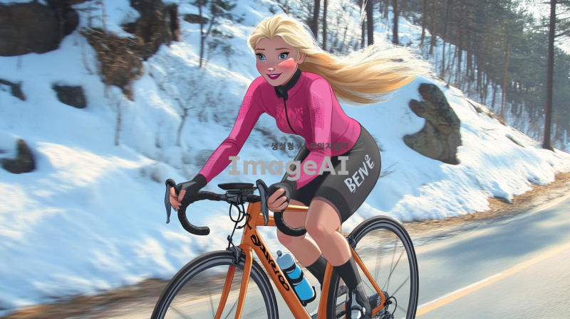 겨울왕국의 엘사가 란도너스 복장을 입고, 아름다운 겨울 풍경 속에서 브레베 로드사이클을 타고 달리는 모습. 엘사의 긴 금발 머리카락이 바람에 흩날리며, 눈 덮인 산과 푸른 하늘이 배경을 이루고 있다. 그녀의 표정은 결단력과 즐거움이 가득하며, 자전거의 디테일과 함께 역동적인 포즈로 생동감 있게 표현된다.