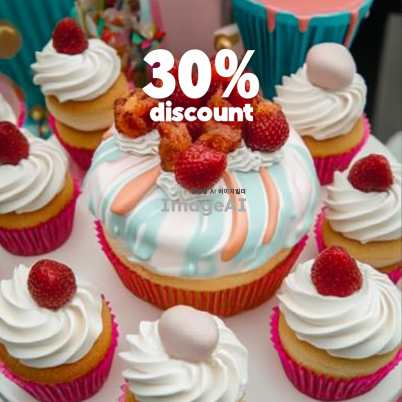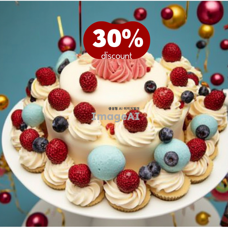 다채로운 색깔의 케이크가 중앙에 배치된 웹사이트 배너 디자인, 케이크 위에는 "30% 할인"이라는 문구가 화려한 글씨체로 적혀있고, 배경은 축제 분위기를 연출하는 다양한 색상의 장식으로 가득 차 있으며, 아기자기한 요소들이 포함된 생동감 넘치는 이미지.