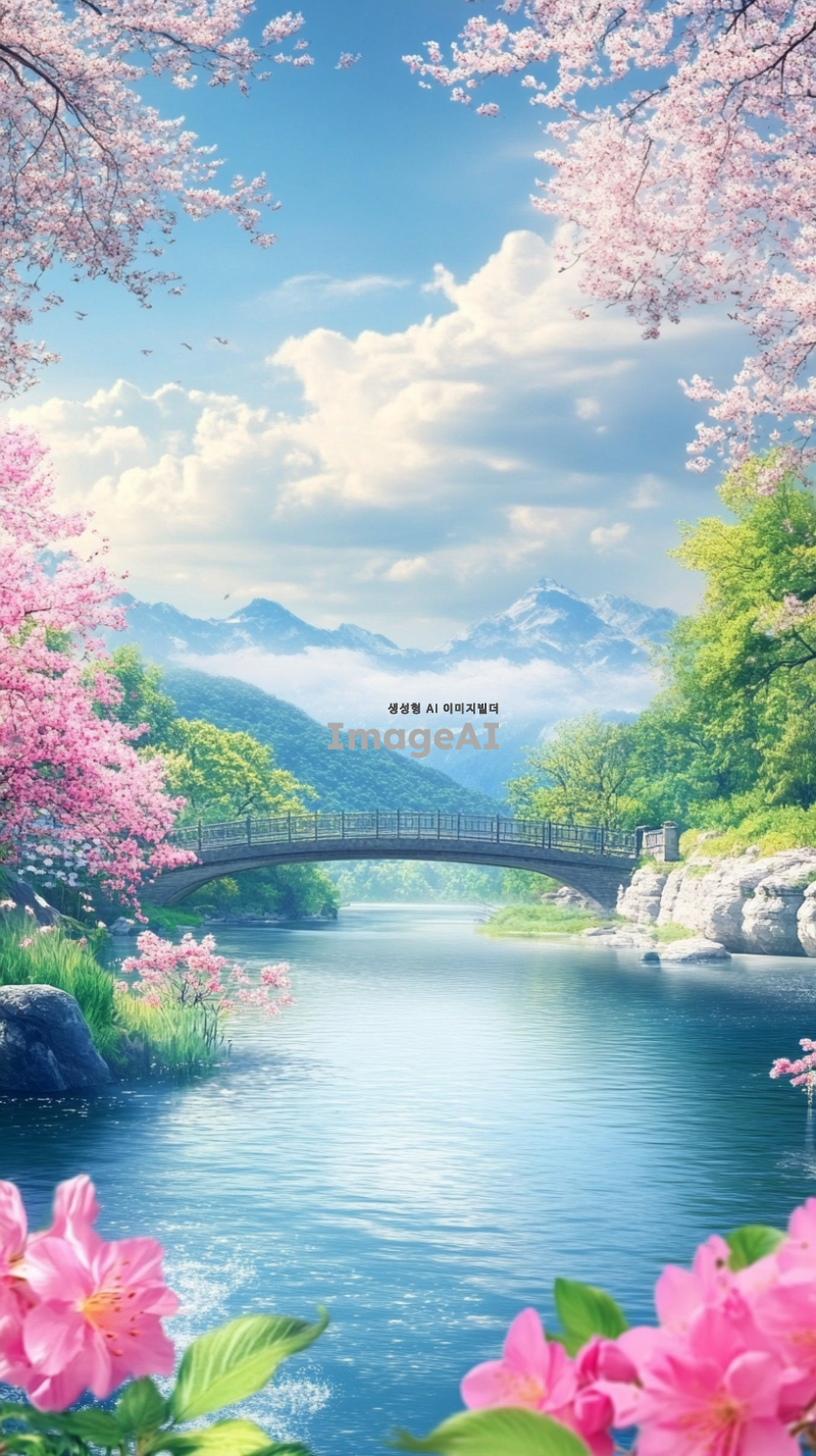 멀리 다리가 보이고 강물이 그 다리 사이를 흐르는 아름다운 풍경. 다리 위에는 화사한 꽃들이 만발해 있고, 배경에는 푸른 하늘과 흰 구름이 부드럽게 흘러가는 모습. 자연의 평화로운 분위기와 함께 따스한 햇살이 비추는 장면.