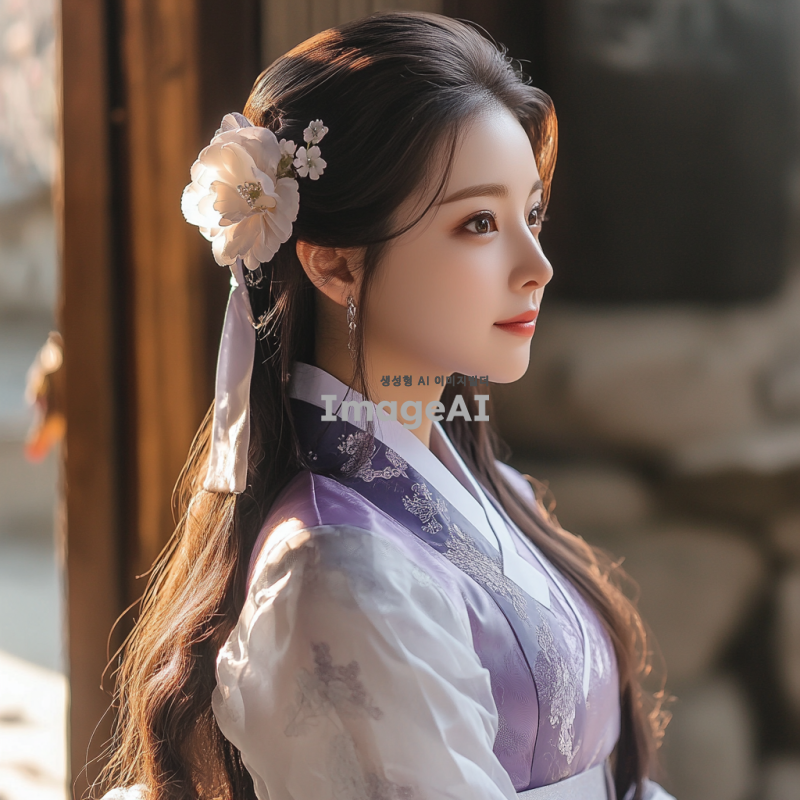 자주색과 흰색 한복을 입고 있는 갈색 긴머리의 한국인 여성, 꽃비녀를 꽂고 있는 모습, 전통적인 배경에서 우아하게 서 있는 모습.
