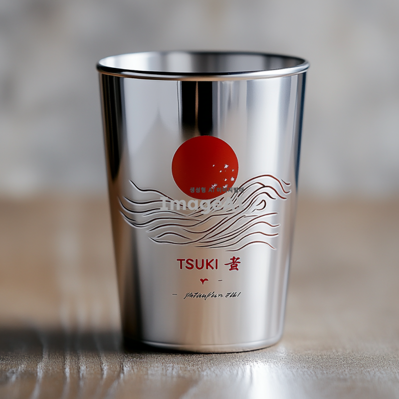 180ml 알루미늄 잔에 새길 로고 디자인, "TSUKI - 静かな夜"라는 텍스트 포함, 달의 실루엣과 파도 패턴을 조화롭게 배치, 도장 느낌의 붉은 인쇄 스타일로 강조. 전체적으로 세련되고 현대적인 감각을 유지하며, 조용하고 평화로운 분위기를 전달하는 디자인.