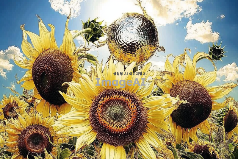 밝고 역동적인 느낌의 해바라기가 가득한 들판, 햇살이 비추는 가운데 해바라기들이 바람에 흔들리며 생동감 넘치는 모습, 푸른 하늘과 흰 구름이 배경에 어우러진 장면, 따뜻한 색감으로 표현된 자연의 아름다움.
