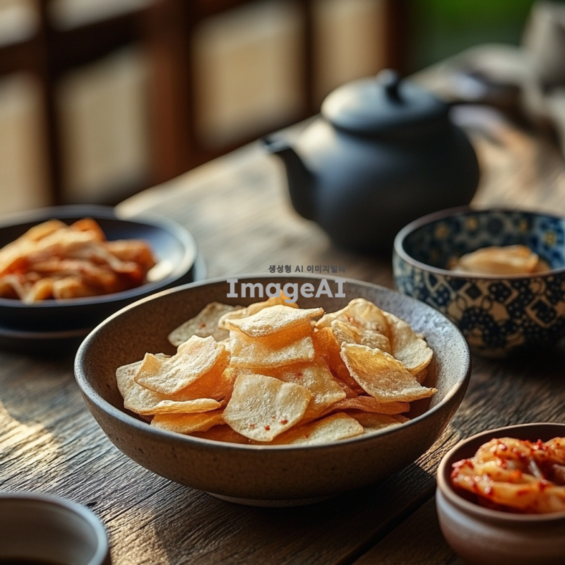 한국의 전통 누룽지를 담은 따뜻한 분위기의 이미지. 누룽지가 담긴 그릇이 나무 테이블 위에 놓여 있고, 주변에는 찻잔과 전통 한국식 반찬이 어우러져 있는 모습. 자연광이 부드럽게 비추어져 아늑한 느낌을 주며, 누룽지의 바삭한 질감과 고소한 색깔이 강조되도록. 배경에는 한국의 전통 문양이 있는 천이나 소품이 살짝 보이도록 구성.