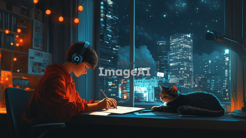 이 이미지는 한 소년이 블루투스 이어폰을 착용하고 창문 밖의 밤하늘이 보이는 도시 풍경을 배경으로 쾌적한 방 안에서 글쓰기나 그림 그리기에 몰두하고있습니다.고양이가 옆에서 잠들어 있어 평온하고 창조적인 분위기를 더해주고있습니다.