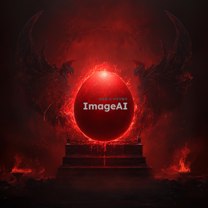 붉은 달걀을 중심으로 한 빨간색 악마 분위기의 웅장한 장면을 그려주세요. 배경은 어두운 색조로 설정하고, 달걀은 빛나는 붉은색으로 강조하여 신비로운 느낌을 줍니다. 주변에는 악마의 상징적인 요소들, 예를 들어 뿔, 날개, 그리고 불꽃 같은 장식들이 어우러져 역동적인 분위기를 연출합니다. 전체적으로 강렬하고 위압적인 느낌이 드는 구성을 원합니다.