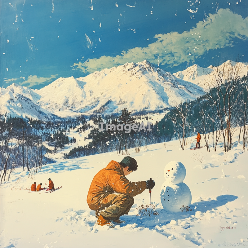 눈 덮인 산과 푸른 하늘 아래 따뜻한 겨울 햇살을 받으며, 두꺼운 겨울 외투를 입고 있는 한국인 남성이 눈사람을 만드는 모습. 주변에는 눈으로 덮인 나무와 겨울 풍경이 펼쳐져 있고, 멀리서 스키를 타는 사람들의 모습이 보인다. 따뜻한 겨울 분위기가 느껴지는 장면.