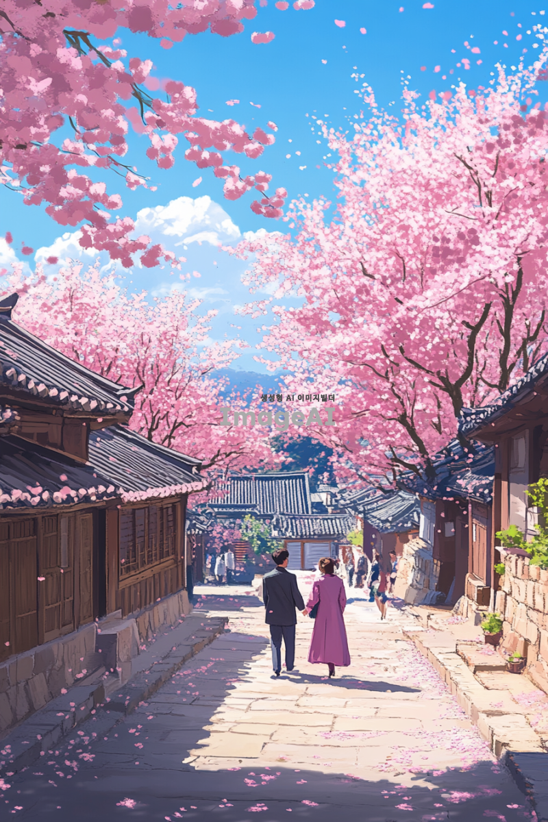 벚꽃이 만개한 거리에서 함께 걷고 있는 두 한국인 남녀의 모습. 따뜻한 봄날, 벚꽃잎이 바람에 흩날리며 아름다운 풍경을 이루고 있다. 두 사람은 서로 웃으며 대화하고 있으며, 주변에는 벚꽃나무와 파란 하늘이 조화를 이루고 있다.