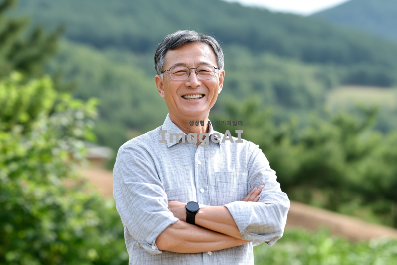 팔짱을 끼고 서 있는 60대 한국 남성이 환하게 웃고 있는 모습의 전신 사진. 배경은 자연 풍경으로, 남성은 편안한 캐주얼 복장을 착용하고 있으며, 얼굴에는 친근한 미소가 가득하다.