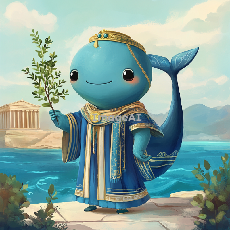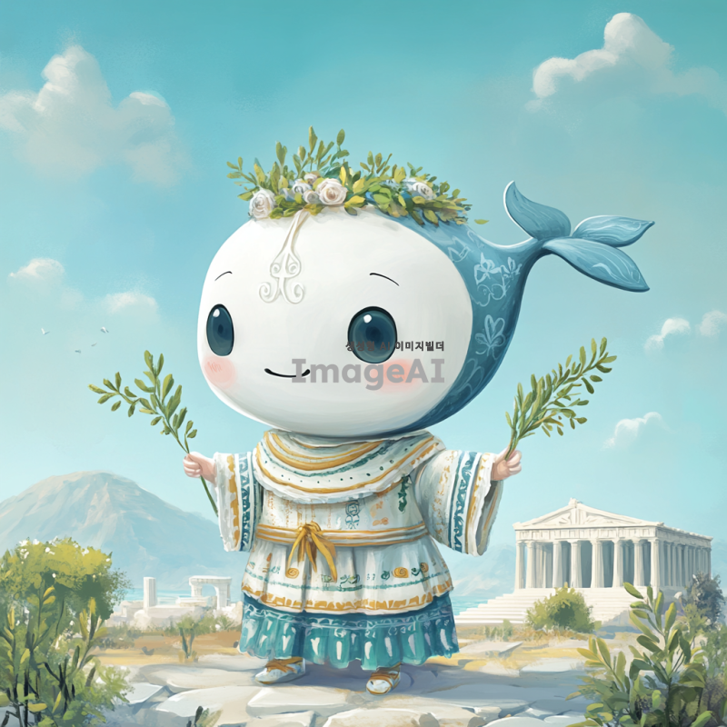 그리스 시대의 전통 복장을 입고, 고래 머리를 가진 귀여운 2등신 캐릭터. 배경은 고대 그리스의 풍경으로, 아테네의 파르테논 신전이 보이는 장면. 캐릭터는 밝고 유쾌한 표정을 지으며, 손에는 작은 올리브 가지를 들고 있다. 전체적으로 아기자기하고 사랑스러운 느낌을 강조.