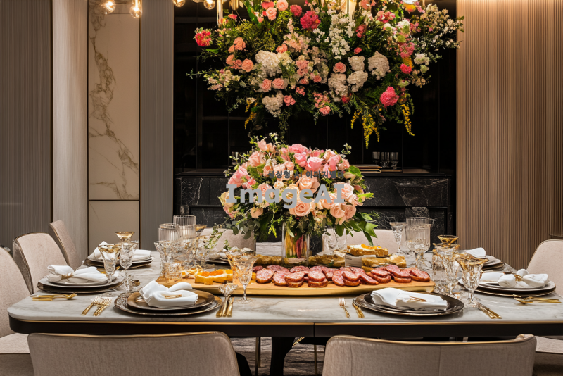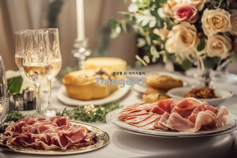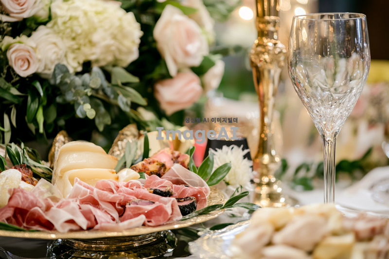 고급스러운 식탁 위에 정성스럽게 차려진 잠봉뵈르가 있는 브런치, 부드러운 조명이 비추는 우아한 분위기의 다이닝 공간, 배경에는 고급스러운 인테리어와 아름다운 꽃장식이 어우러져 있는 장면.