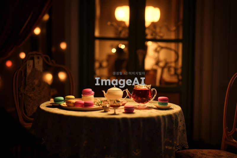 고급스러운 분위기의 아늑한 식탁 위에 잠봉뵈르와 히비스커스 차, 그리고 다양한 색상의 마카롱이 놓여 있는 장면. 따뜻한 조명이 비추는 식탁은 우아한 테이블보와 함께 세팅되어 있으며, 주변에는 편안한 의자와 아기자기한 장식들이 배치되어 있어 아늑한 느낌을 주는 공간. 전체적으로 화사하지 않지만 세련된 느낌을 살린 이미지.