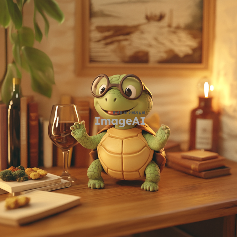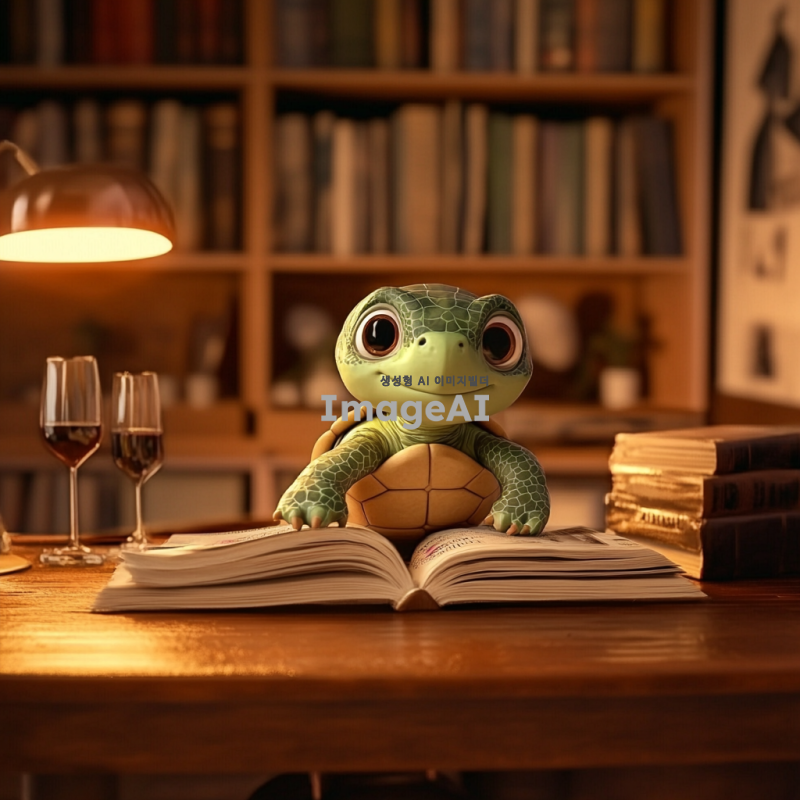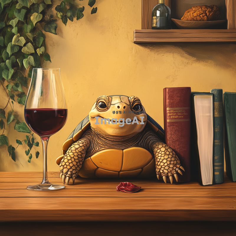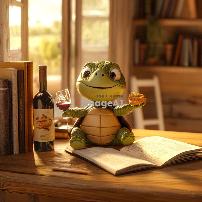 귀여운 거북이가 책상에 앉아있는 모습, 나무로 만든 책상과 따뜻한 배경, 나무로 만든 책상 위에는 책과 와인이 있고, 거북이는 웃고 있는 표정으로 음식을 상상하고 있는 모습.