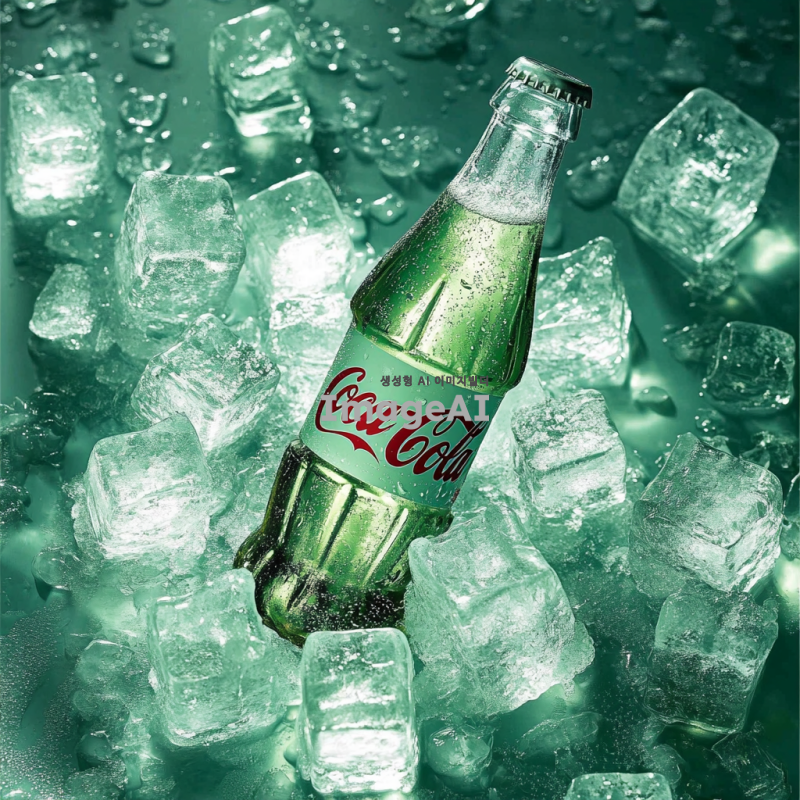 얼음에 둘러싸인 시원한 코카콜라 한 병, 주변에는 얼음 조각들이 흩어져 있어 차가운 분위기를 연출, 초록 빛이 얼음과 병에 반사되어 빛나는 장면.