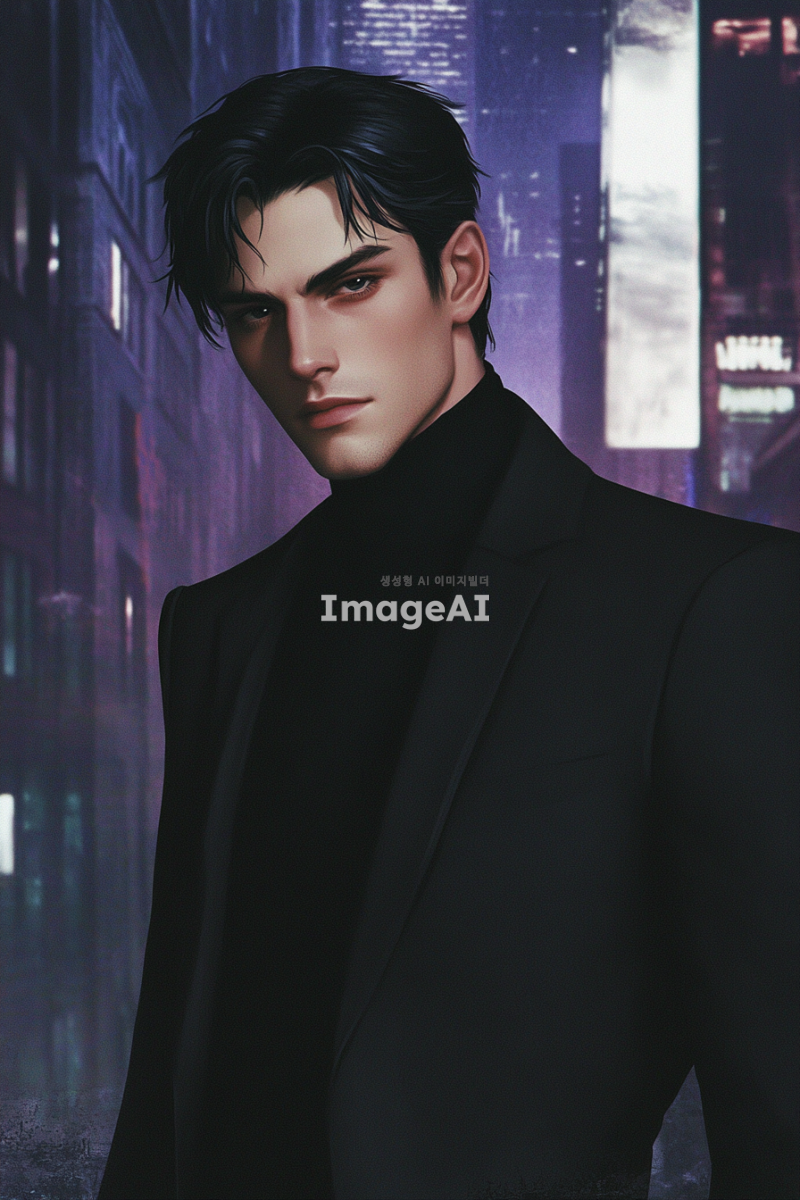 국정원 요원으로서 매우 잘생긴 남성, 검은 머리와 검은 눈을 가진 모습. 검정색 정장을 입고 있으며, 강렬한 눈빛과 자신감 넘치는 자세로 서 있는 모습. 배경은 현대적인 도시 풍경으로, 긴장감과 신비로운 분위기가 느껴지는 장면.