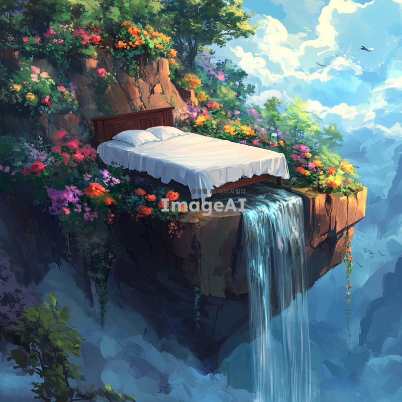 절벽 중간에 튀어나온 돌 위에 올라가 있는 포근하고 아름다운 침대를 그려주세요. 침대 주변에는 다양한 색깔의 꽃들이 피어있고, 침대 위쪽에서는 시원한 폭포가 흐르고 있는 장면을 표현해주세요. 자연의 아름다움과 평화로운 분위기가 느껴지도록 해주세요.