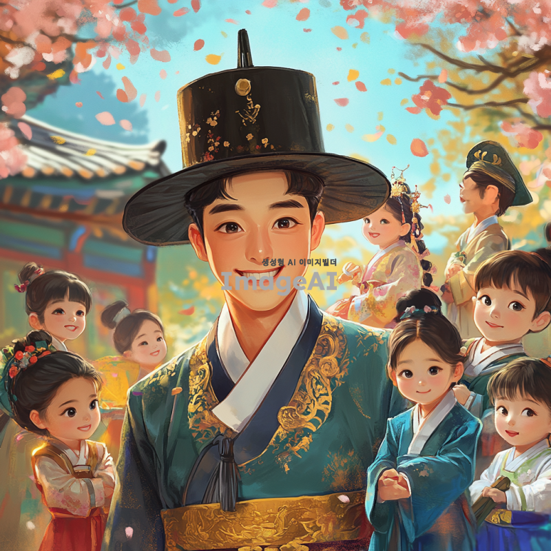 조선시대 장군 캐릭터, 아이들에게 친숙한 모습, 전통 한복을 입고, 따뜻한 미소를 지으며, 동화 같은 배경 속에서 아이들과 함께 있는 장면, 밝고 화사한 색감, 친근한 표정, 역사적 요소와 현대적 감각이 조화롭게 어우러진 이미지