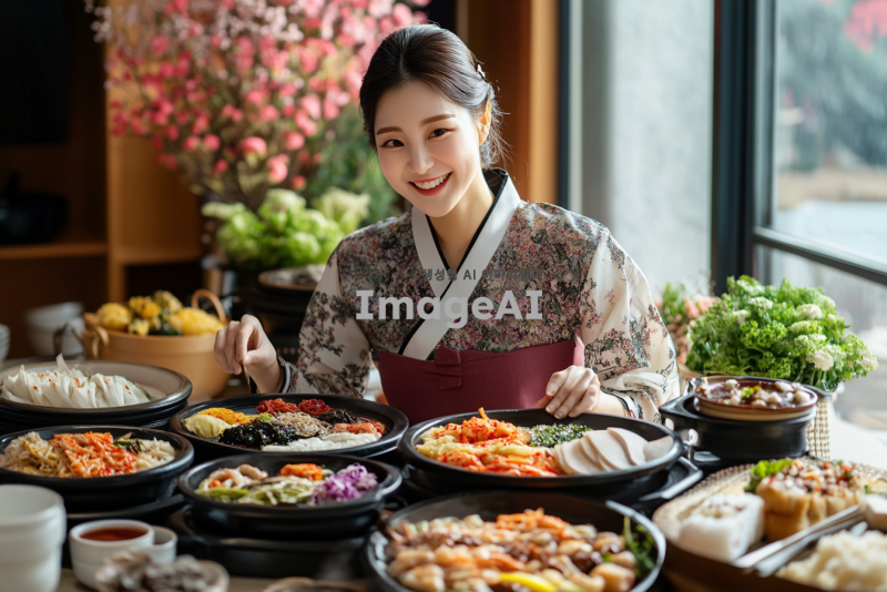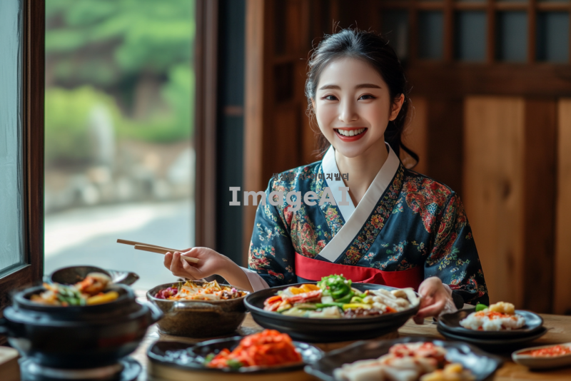 다채로운 한국 전통 음식을 맛있게 먹고 있는 2030 현대 한국 여성, 다양한 종류의 비빔밥, 김치, 불고기, 전통 떡, 정갈하게 차려진 상차림, 따뜻한 분위기, 즐거운 표정, 전통 한복을 입고 있는 모습, 한국의 전통 식문화가 느껴지는 배경