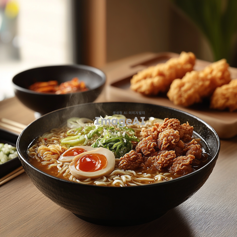 한국의 전통적인 라면과 바삭한 치킨이 함께 담긴 정갈한 한 상차림, 따뜻한 김이 나는 라면 그릇과 황금빛으로 튀겨진 치킨 조각들이 조화롭게 배치되어 있는 모습, 배경은 아늑한 식탁과 부엌의 따뜻한 조명, 식욕을 자극하는 색감과 질감, 편안하고 따뜻한 분위기.