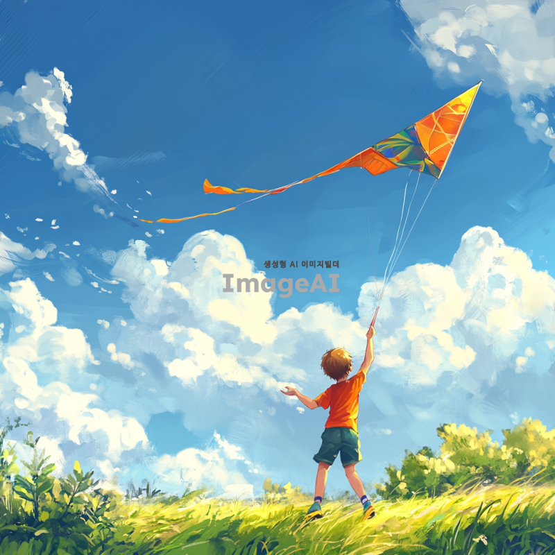 남자 어린이가 파란 하늘 아래 넓은 들판에서 연을 날리고 있는 모습. 어린이는 밝은 색상의 티셔츠와 반바지를 입고 있으며, 얼굴에는 행복한 미소가 가득하다. 연은 다채로운 색상으로, 바람에 휘날리며 하늘을 가로지르고 있다. 배경에는 푸른 하늘과 흰 구름, 그리고 푸른 풀밭이 펼쳐져 있어 평화롭고 즐거운 분위기를 연출하고 있다.