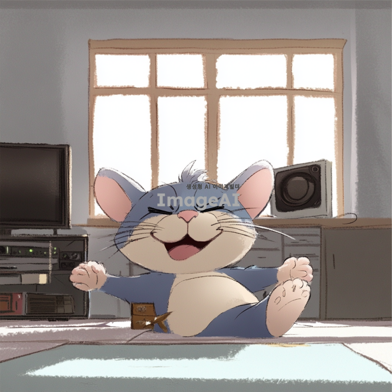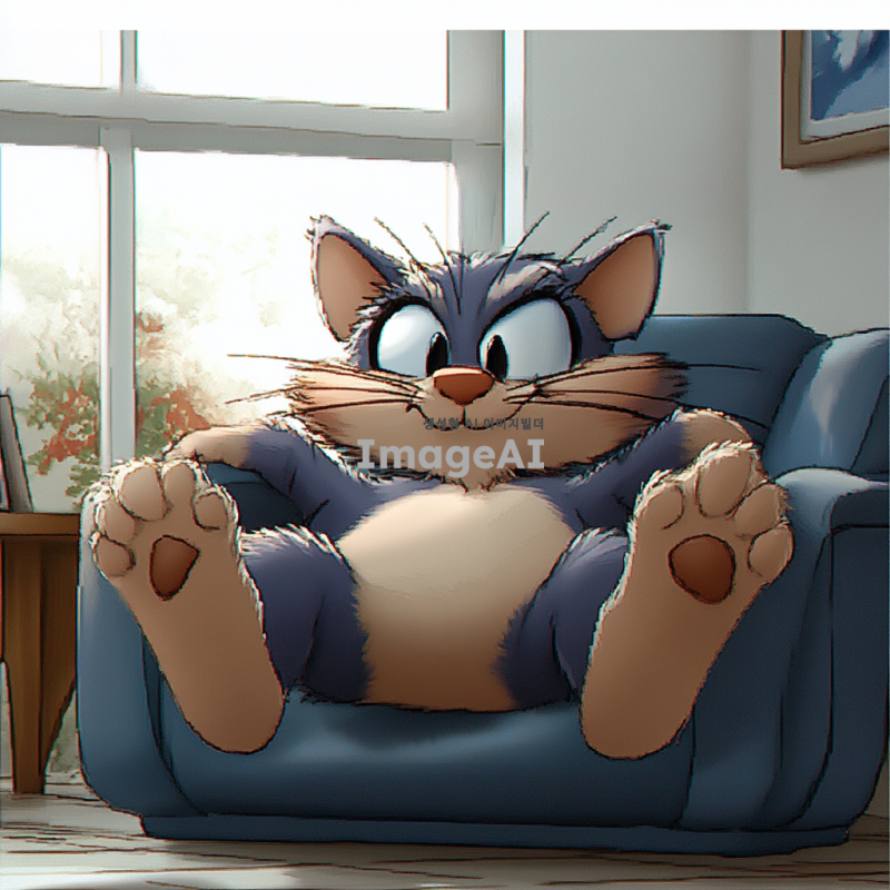 한국의 만화 스타일로 그려진 톰과 제리의 톰 캐릭터, 귀여운 표정과 생동감 넘치는 포즈, 배경은 아늑한 거실, 따뜻한 색감과 세밀한 디테일, 유머러스한 분위기 강조.