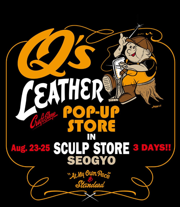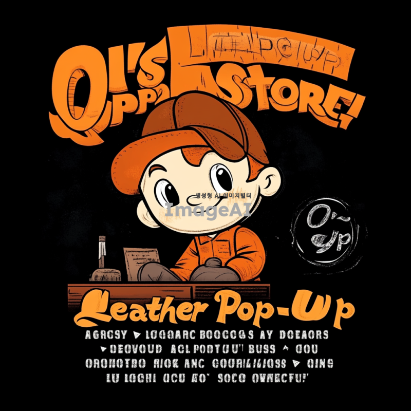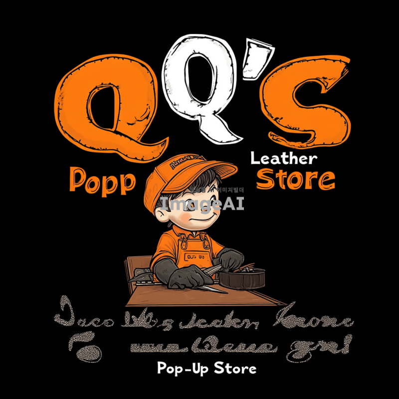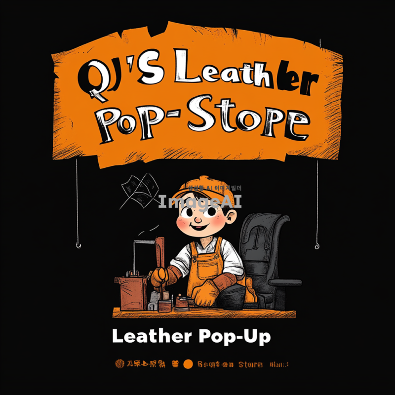 검은색 배경에 오렌지색과 흰색으로 "Q's Leather Pop-Up Store"라는 제목이 중앙에 위치해 있습니다. 그 아래에는 작은 남자 캐릭터가 중년의 모습으로 가죽공예 작업을 하고 있습니다. 그는 밝은 주황색 작업복을 입고 갈색 모자를 쓰고 있으며, 웃는 표정으로 작업에 집중하고 있습니다. 캐릭터는 앉아서 작업하는 자세로, 팝업 스토어를 알리는 간판 배경이 함께 그려져 있습니다. 간판의 상단은 밝은 주황색, 중앙은 흰색 폰트, 하단은 검은색, 빨간색, 흰색이 조화를 이루고 있습니다. 제목 아래에는 팝업 기간, 장소, 추가 정보가 표시되어 있습니다. 전체적인 분위기는 가죽공예 팝업 스토어의 홍보 이미지로, 남자 캐릭터는 이미지 중앙에 직면하고 있습니다. 구성은 상단에 제목을 두고 중앙에 주요 캐릭터를 배치하여 가독성과 시각적인 균형을 유지합니다. 색상은 따뜻한 오렌지, 갈색, 검정색 계열의 밝고 선명한 색상으로, 글자는 강렬하고 분명하게 나타납니다. 디자인 스타일은 만화풍이며, 빈티지한 느낌을 주는 일러스트레이션입니다.