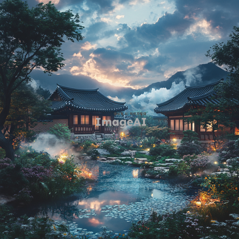 초현실적인 분위기로 변형된 한국의 전통 마을 풍경. 고요한 아침 안개 속에서 반짝이는 연못과 이국적인 식물들로 가득한 정원, 그리고 하늘을 가로지르는 화려한 색상의 구름. 전통 한옥이 신비롭게 빛나는 모습, 주변에 환상적인 생명체들이 어우러져 있는 장면. 전체적으로 몽환적이고 꿈같은 느낌을 강조하여 표현.